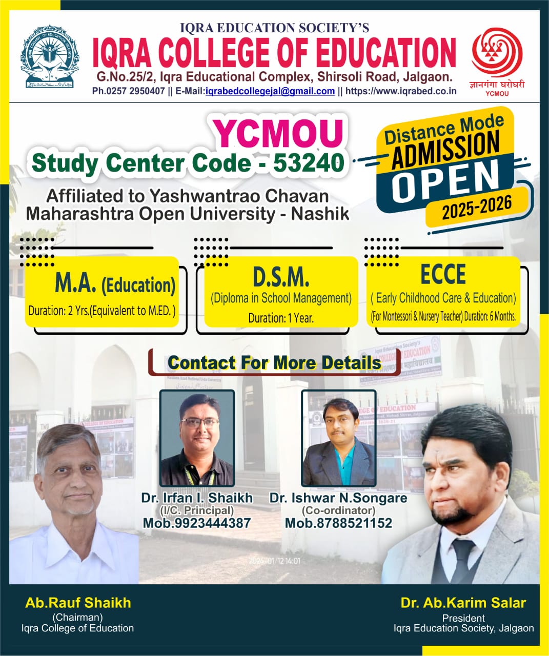 College Magazine Horizon 2024-25Iqra College of Education (Estd. 1992) is located at Iqra Nagar, Shirsoli Road, a suburb of Jalgaon city. Iqra B.Ed College was started specifically to cope up with the shortage of trained Urdu teachers, and to fulfill the ever-growing educational demand of minorities of the district. Iqra B.Ed. College offers Urdu as one of its methods, and therefore holds a unique position in Kavayitri Bahinabai Chaudhari North Maharashtra University, Jalgaon.